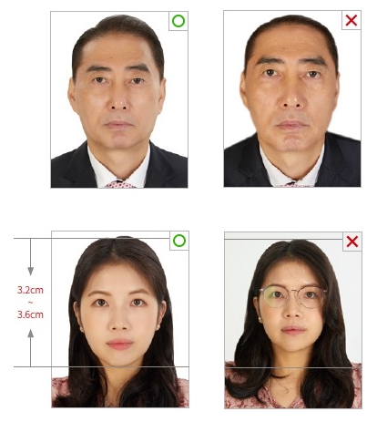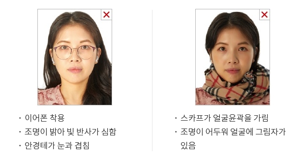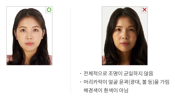 눈썹과 귀가 보이도록 촬영하고 흰색 배경을 사용하여야 해요. 또한 안경 빛 반사시 사용할 수 없으니 안경을 벗고 사진을 촬영하는 것이 좋습니다.
