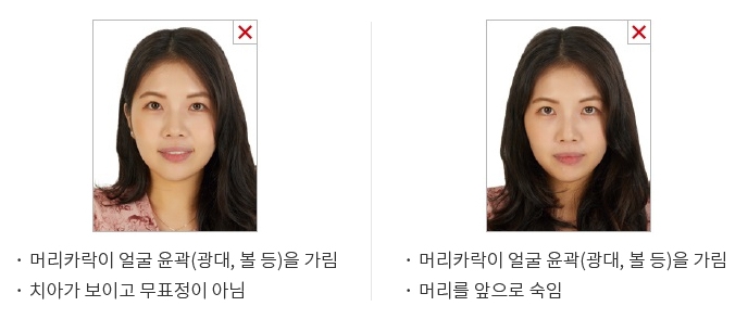 머리카락이 눈 또는 얼굴의 윤곽(볼, 광대)를 가려서는 안됩니다.