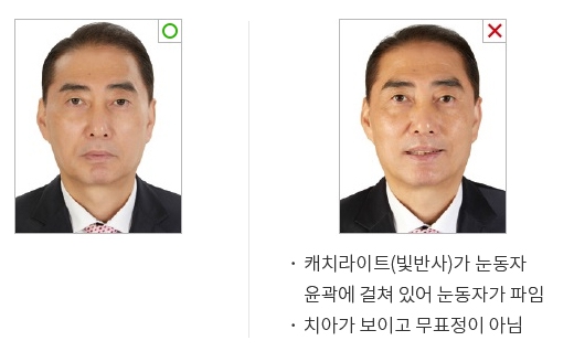 시선은 정면을 향하고 눈동자에 적목현상이 없게 촬영되어야 합니다.
