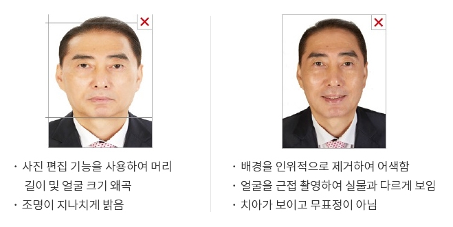 사진편집 프로그램을 이용하여 배경을 지우거나 흰색배경에 인물을 합성한 사진은 사용할 수 없어요.