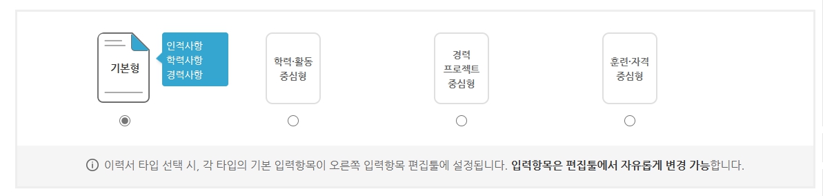 이력서는 인적사항이나 학력, 경력만 들어가는 기본형이 있고, 학력과 활동 중심형, 경력 프로젝트 중심형, 훈련과 자격 중심형 이력서를 선택하여 작성할 수 있습니다.