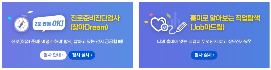 진로준비진단 검사와 흥미로 알아보는 직업탐색 검사 외에도 직업선호도검사, 구직준비도검사, 창업적성검사, 직업가치관검사 등이 있으니 확인해 보고 해당하는 검사를 받아보세요.