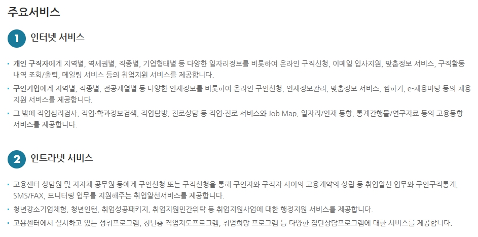 개인 구직자에게는 지역별, 직종별, 기업형태별 일자리 정보나 온라인을 통한 구직신청, 입사지원, 다양한 맞춤정보 서비스 등을 제공하고 있습니다.