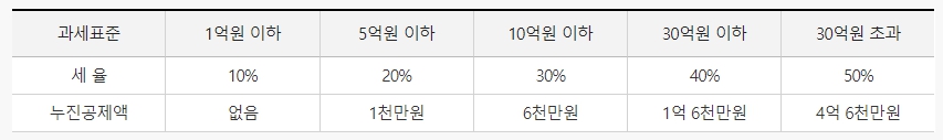 결정된 증여세 과세표준 금액에 따른 세율을 계산하면 증여세 산출세액이 나옵니다. 최저 10%에서 최고 50%까지 세율이 적용됩니다.